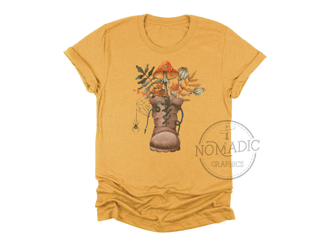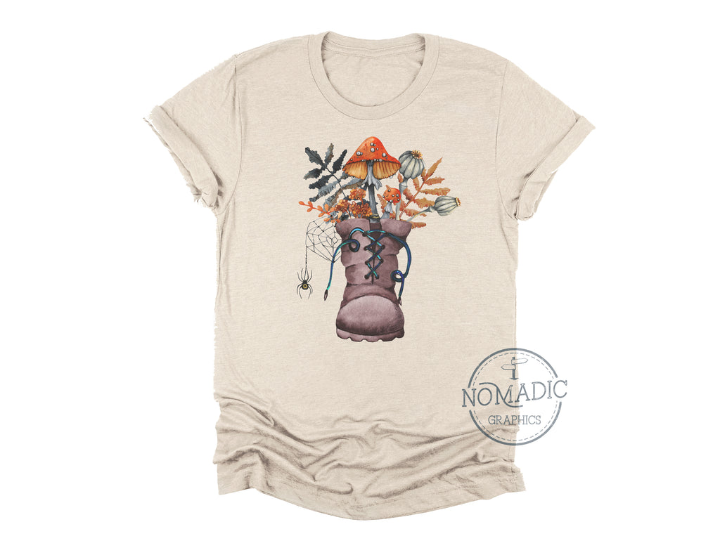An old rustic hiking book full of autumnal goodness. A little mouse peeking out and a garden spider dangles from above.