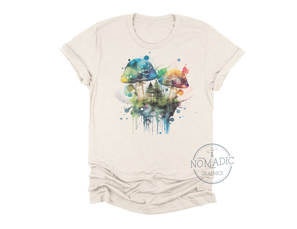 Magical mushrooms and misty forest in watercolor style.